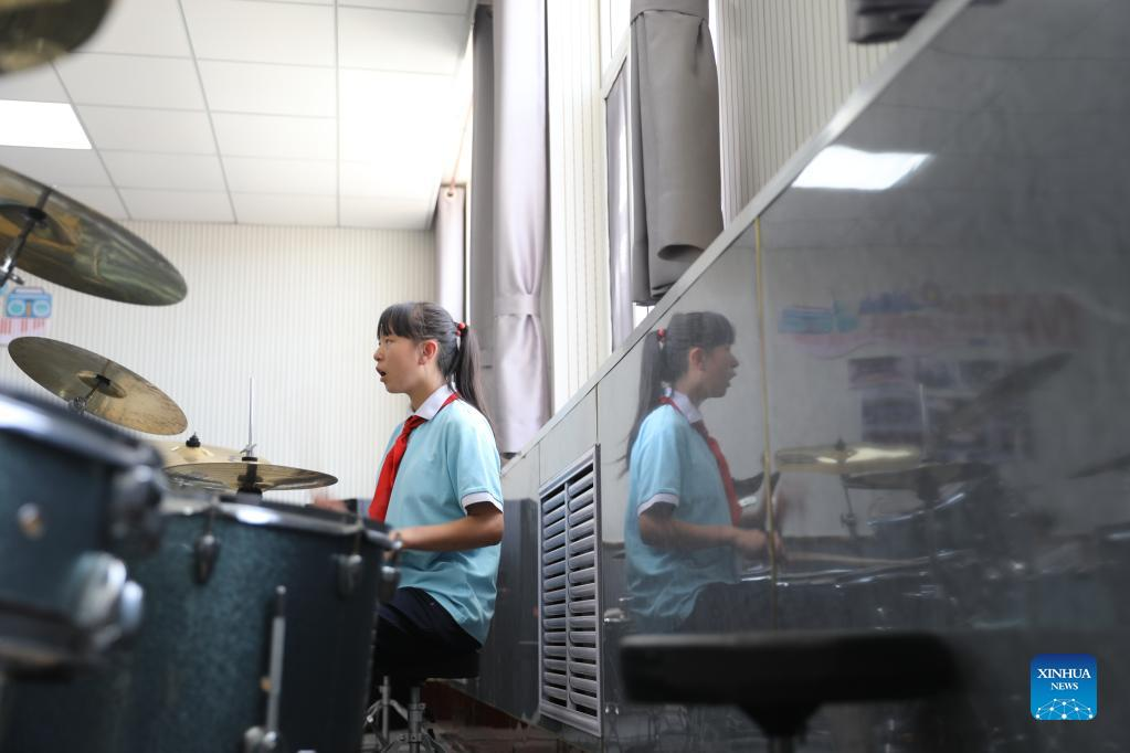 Student Li Aitong plays the drum set at the music classroom of Xinji Special Education School in Xinji, north China's Hebei Province, May 31, 2022. In the municipal special-education school of Xinji City, Hebei Province, a jazz drumming band named "Against the Wind" is making hopeful beats in world of silence. Founded in December 2018, the band is home to 10 students with hearing impairment or intellectual disability. The band has been undergoing systematic and hard training since its establishment and the endeavors paid off when the band made a stunning rendering in the city's cultural performance among primary and secondary school students. "I named the band 'Against the Wind' to encourage the students to hold onto their dreams, have the grit to face up to challenges and new things as well as fly bravely toward their bright futures," said Sun Shicha, a teacher of the special-education school and the organizer of the jazz drumming band. In 2020, the school created a specialized music classroom, where the band can carry out routine practices. So far, the drum band is able to perform some 10 pieces of music. "The drum band has an invisible and formative influence on teenagers," said Sun. "The students are seen with more resilience and confidence since they joined the band. Meanwhile, their ability in terms of coordination and comprehension have also greatly improved." (Xinhua/Luo Xuefeng)