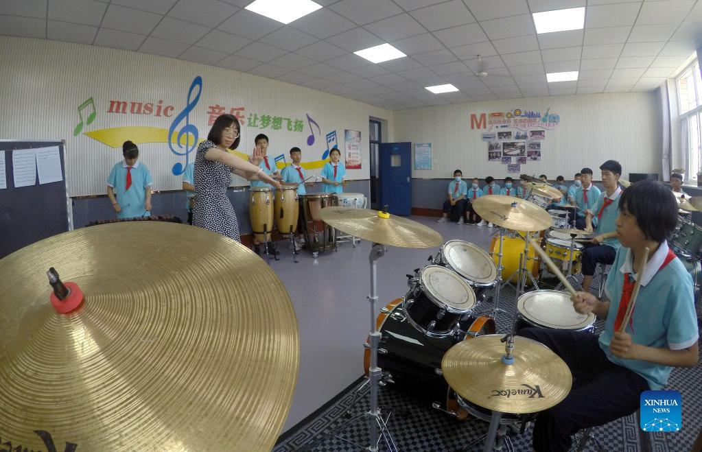 Teacher Sun Shicha (2nd L) gives instruction to the band at the music classroom of Xinji Special Education School in Xinji, north China's Hebei Province, May 31, 2022. In the municipal special-education school of Xinji City, Hebei Province, a jazz drumming band named "Against the Wind" is making hopeful beats in world of silence. Founded in December 2018, the band is home to 10 students with hearing impairment or intellectual disability. The band has been undergoing systematic and hard training since its establishment and the endeavors paid off when the band made a stunning rendering in the city's cultural performance among primary and secondary school students. "I named the band 'Against the Wind' to encourage the students to hold onto their dreams, have the grit to face up to challenges and new things as well as fly bravely toward their bright futures," said Sun Shicha, a teacher of the special-education school and the organizer of the jazz drumming band. In 2020, the school created a specialized music classroom, where the band can carry out routine practices. So far, the drum band is able to perform some 10 pieces of music. "The drum band has an invisible and formative influence on teenagers," said Sun. "The students are seen with more resilience and confidence since they joined the band. Meanwhile, their ability in terms of coordination and comprehension have also greatly improved." (Xinhua/Luo Xuefeng)