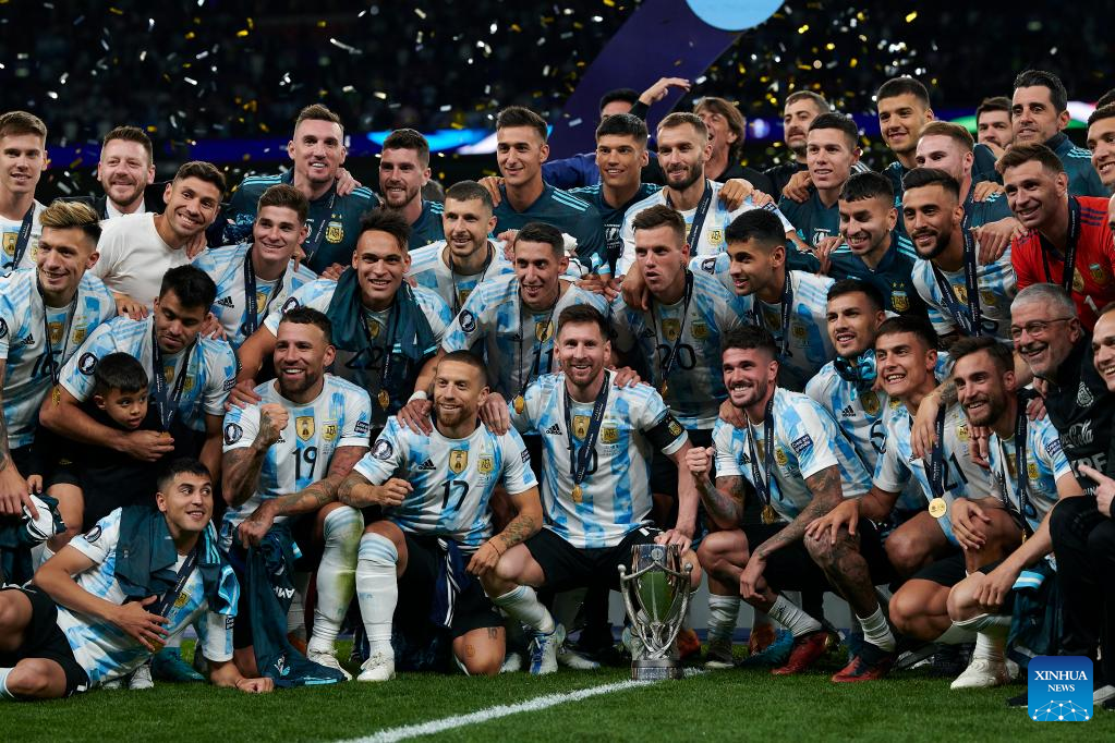 Players of Argentina pose for photo during the awarding ceremony of the Finalissima 2022 match between Italy and Argentina in London, Britain, June 1, 2022. (Photo by Pablo Morano/Xinhua)