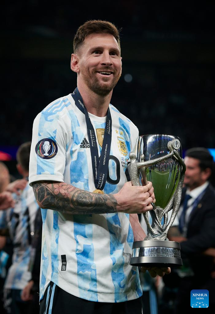 Lionel Messi of Argentina celebrates with the trophy after winning the Finalissima 2022 match between Italy and Argentina in London, Britain, June 1, 2022. (Photo by Pablo Morano/Xinhua)