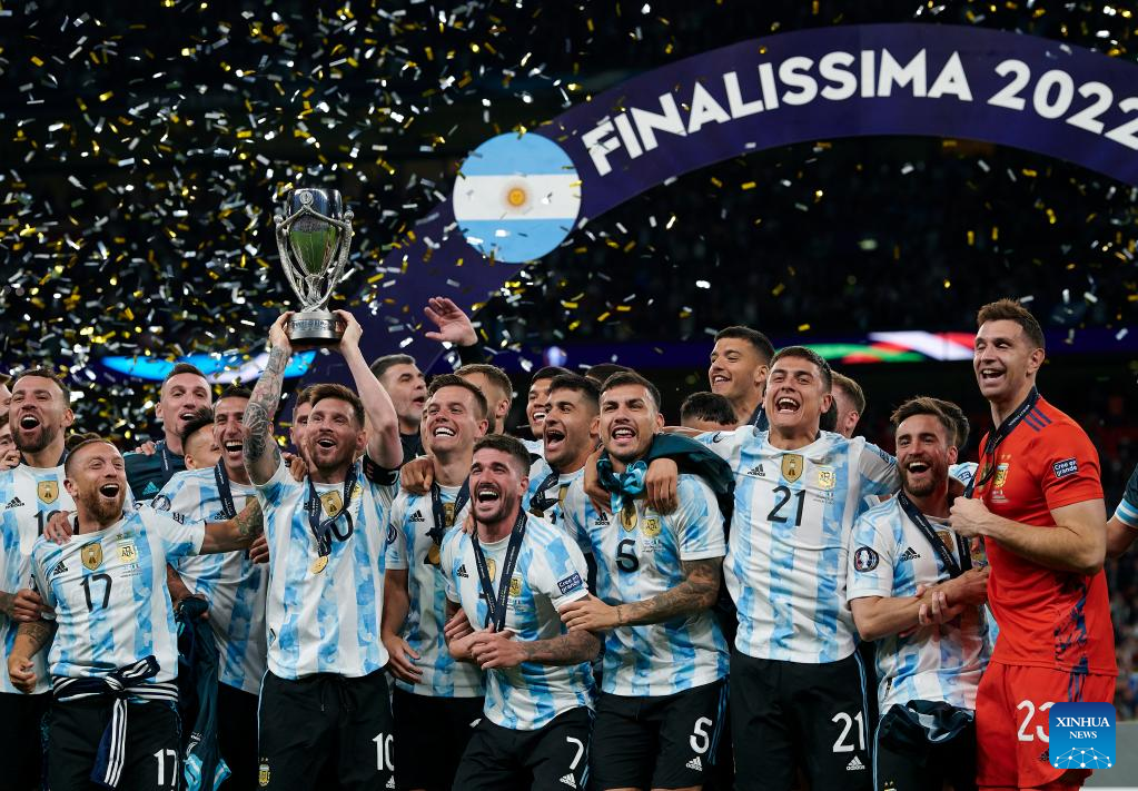Lionel Messi (2nd L, front) of Argentina celebrates with the trophy with his teammates after winning the Finalissima 2022 match between Italy and Argentina in London, Britain, June 1, 2022. (Photo by Pablo Morano/Xinhua)