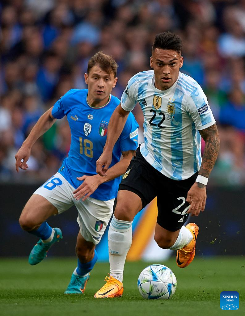 Lautaro Martinez (Front) of Argentina controls the ball during the Finalissima 2022 match between Italy and Argentina in London, Britain, June 1, 2022. (Photo by Pablo Morano/Xinhua)