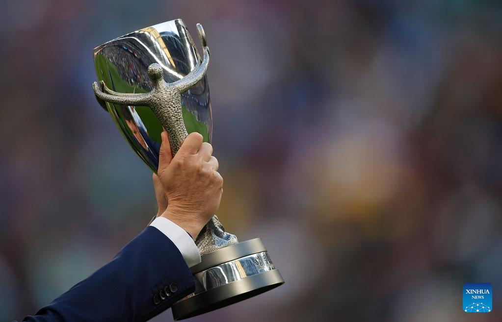 Javier Zanetti, former player of Argentina holds the trophy prior to the Finalissima 2022 match between Italy and Argentina in London, Britain, June 1, 2022. (Photo by Pablo Morano/Xinhua)