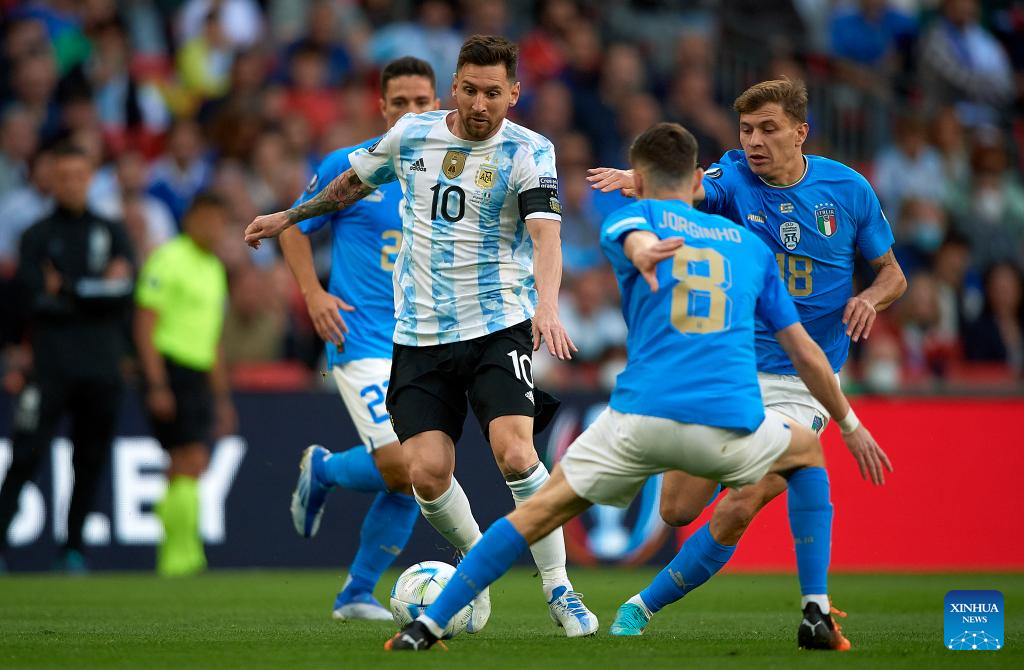 Lionel Messi (2nd L) of Argentina vies with Jorginho (2nd R) of Italy during the Finalissima 2022 match between Italy and Argentina in London, Britain, June 1, 2022. (Photo by Pablo Morano/Xinhua)