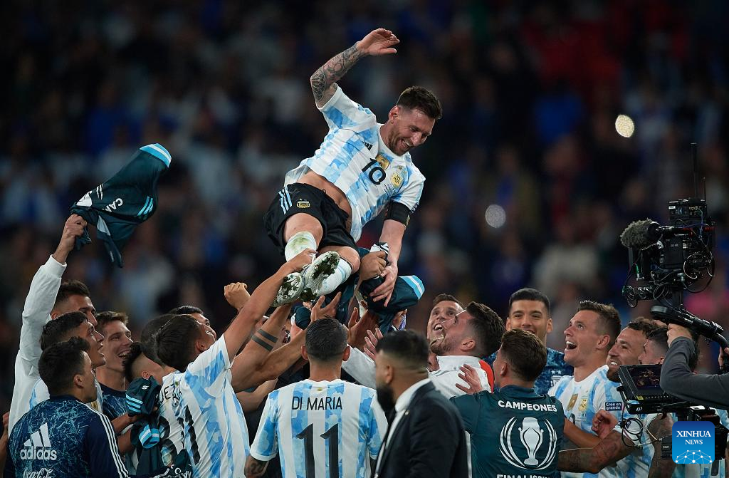 Lionel Messi (Top) of Argentina is thrown into the air by his teammates as they celebrate victory after the Finalissima 2022 match between Italy and Argentina in London, Britain, June 1, 2022. (Photo by Pablo Morano/Xinhua)