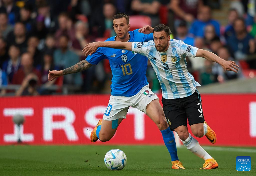 Nicolas Tagliafico (R) of Argentina vies with Federico Bernardeschi of Italy during the Finalissima 2022 match between Italy and Argentina in London, Britain, June 1, 2022. (Photo by Pablo Morano/Xinhua)