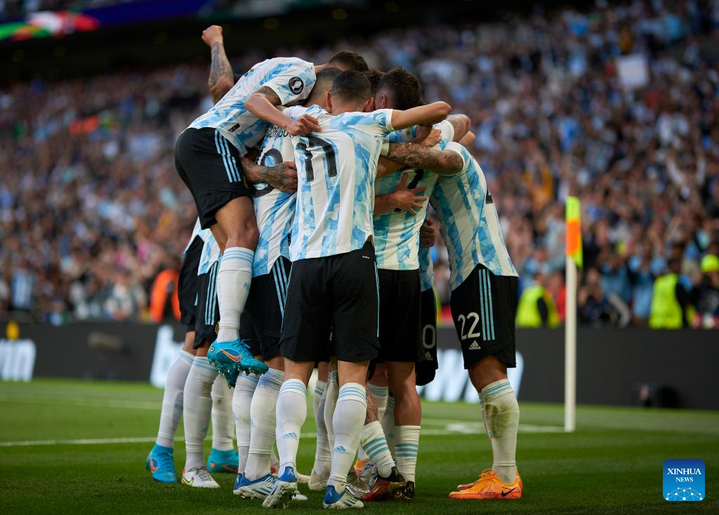 Players of Argentina celebrates a goal during the Finalissima 2022 match between Italy and Argentina in London, Britain, June 1, 2022. (Photo by Pablo Morano/Xinhua)