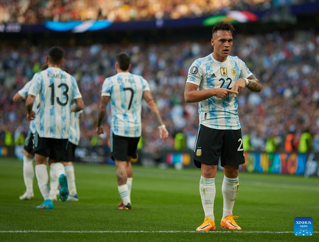 Lautaro Martinez (1st R) of Argentina celebrate his goal during the Finalissima 2022 match between Italy and Argentina in London, Britain, June 1, 2022. (Photo by Pablo Morano/Xinhua)