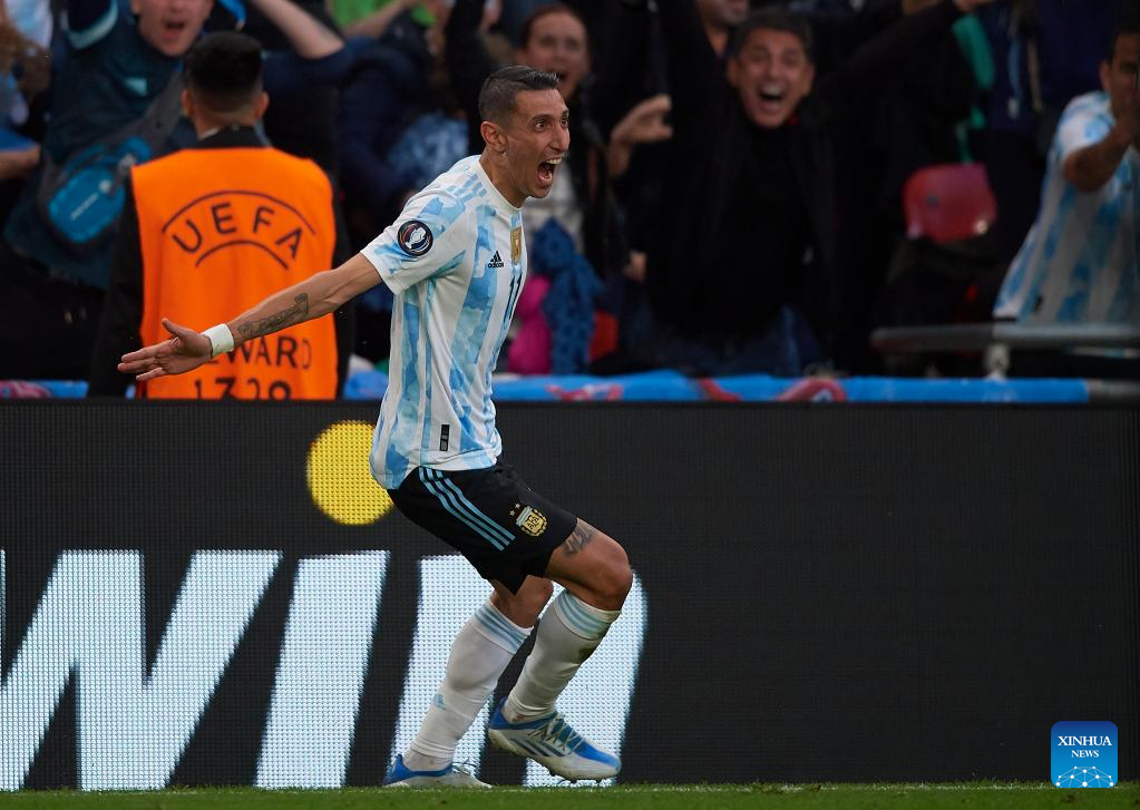 Angel Di Maria of Argentina celebrates his goal during the Finalissima 2022 match between Italy and Argentina in London, Britain, June 1, 2022. (Photo by Pablo Morano/Xinhua)