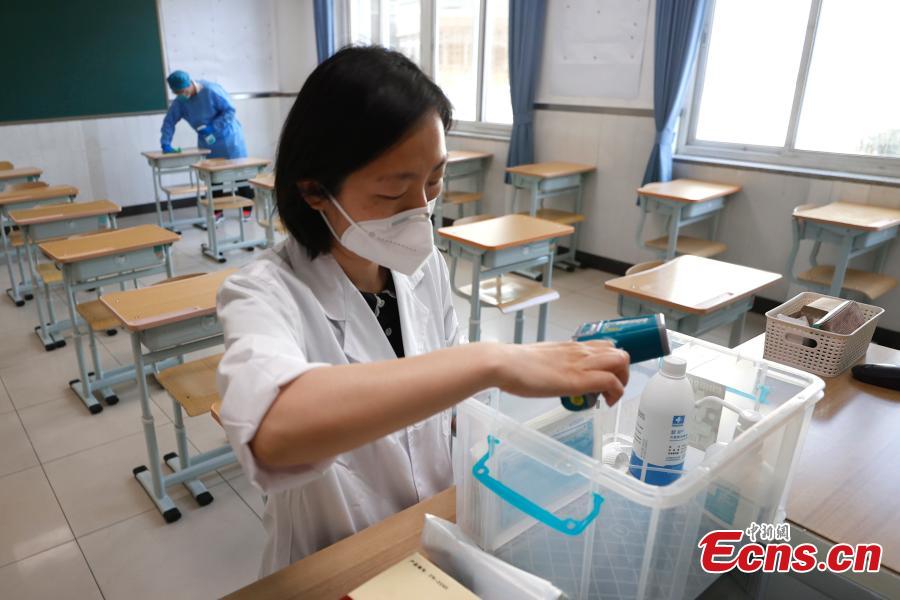 A teacher arranges epidemic prevention supplies at Dongzhimen high school, in Beijing, June 1, 2022. (Photo: China News Service/Fu Tian)