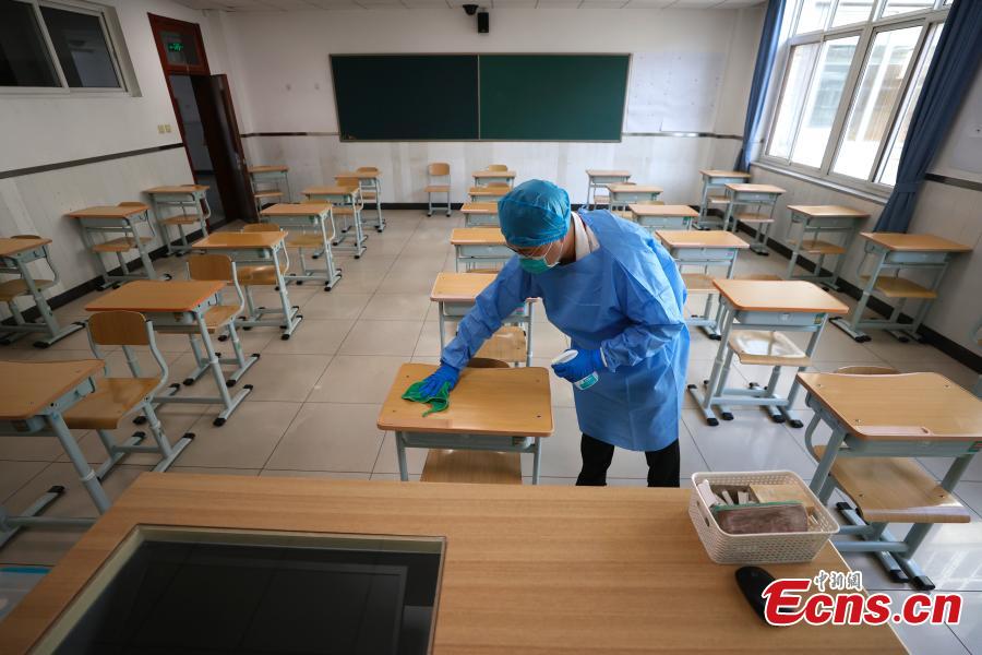 A teacher disinfects desks at a class room at Dongzhimen high school, in Beijing, June 1, 2022. (Photo: China News Service/Fu Tian)