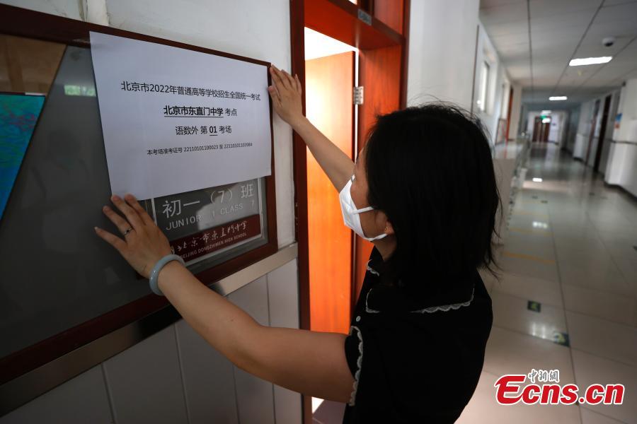 A teacher posts test room information at Dongzhimen high school in Beijing, June 1, 2021. (Photo: China News Service/Fu Tian)