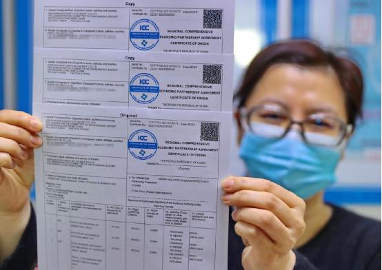 A staff member with the trade promotion council of Qinhuangdao, north China’s Hebei province, shows the first certificate of origin under the Regional Comprehensive Economic Partnership (RCEP) issued by the council, Jan. 28, 2022. (People’s Daily Online/Cao Jianxiong)