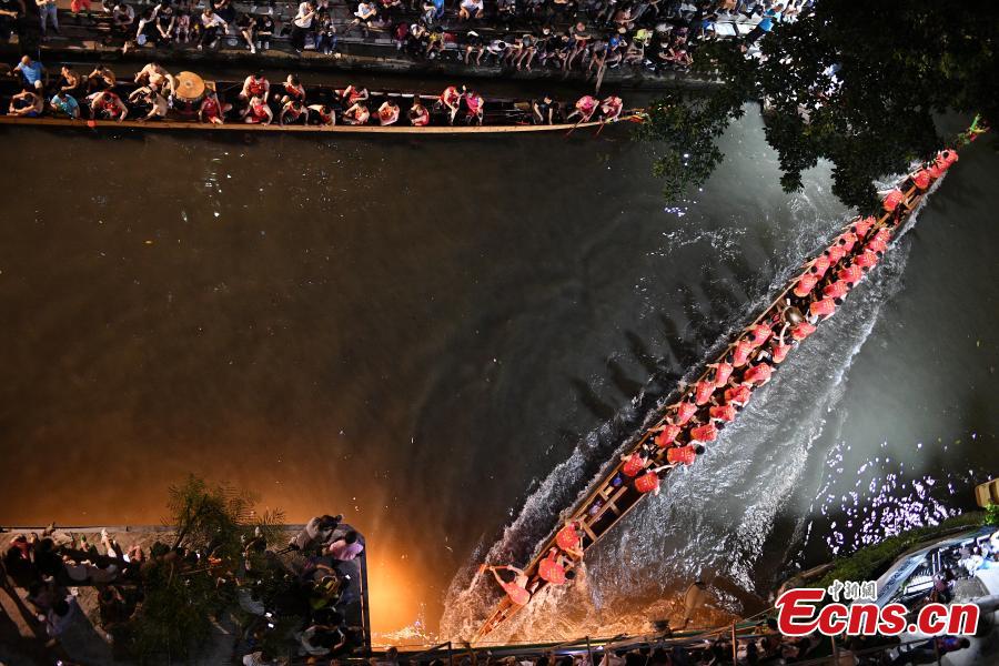 People take part in night training of Diejiao dragon boat drifting to greet the upcoming Dragon Boat Festival or Duanwu Festival in Foshan, south China's Guangdong Province, June 1, 2022. (Photo: China News Service/Chen Chuhong)