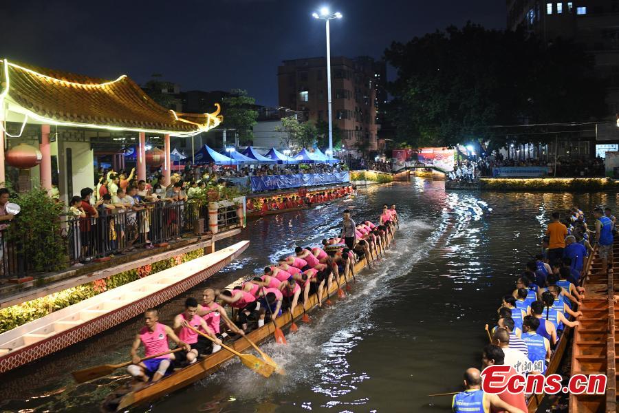 People take part in night training of Diejiao dragon boat drifting to greet the upcoming Dragon Boat Festival or Duanwu Festival in Foshan, south China's Guangdong Province, June 1, 2022. (Photo: China News Service/Chen Chuhong)