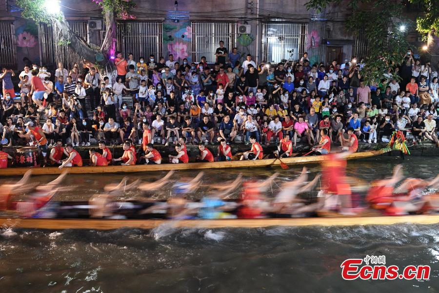 People take part in night training of Diejiao dragon boat drifting to greet the upcoming Dragon Boat Festival or Duanwu Festival in Foshan, south China's Guangdong Province, June 1, 2022. (Photo: China News Service/Chen Chuhong)