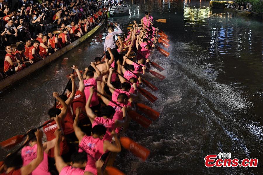People take part in night training of Diejiao dragon boat drifting to greet the upcoming Dragon Boat Festival or Duanwu Festival in Foshan, south China's Guangdong Province, June 1, 2022. (Photo: China News Service/Chen Chuhong)