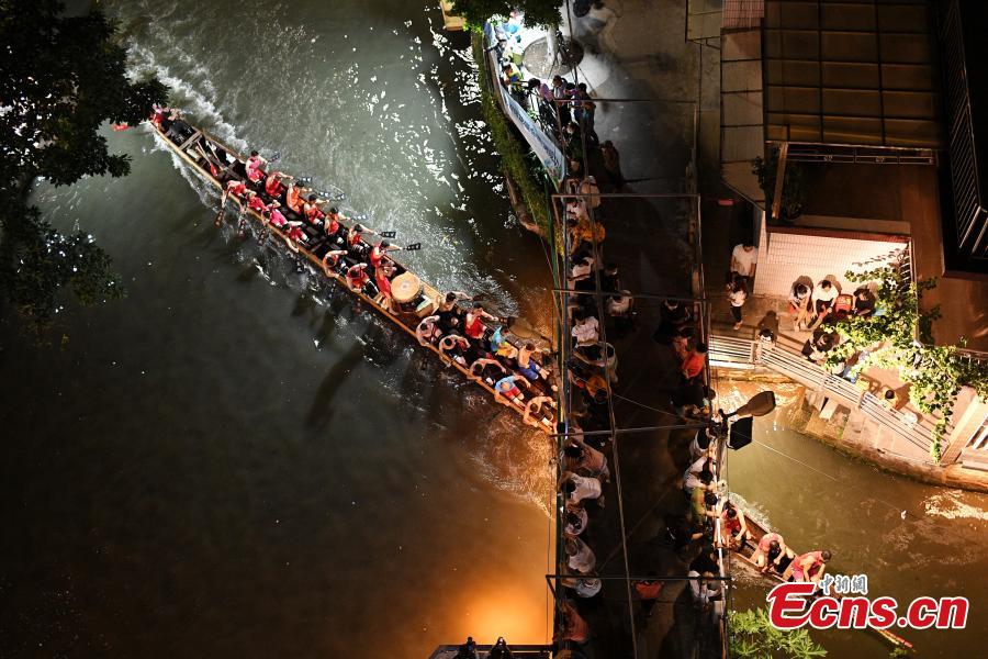 People take part in night training of Diejiao dragon boat drifting to greet the upcoming Dragon Boat Festival or Duanwu Festival in Foshan, south China's Guangdong Province, June 1, 2022. (Photo: China News Service/Chen Chuhong)