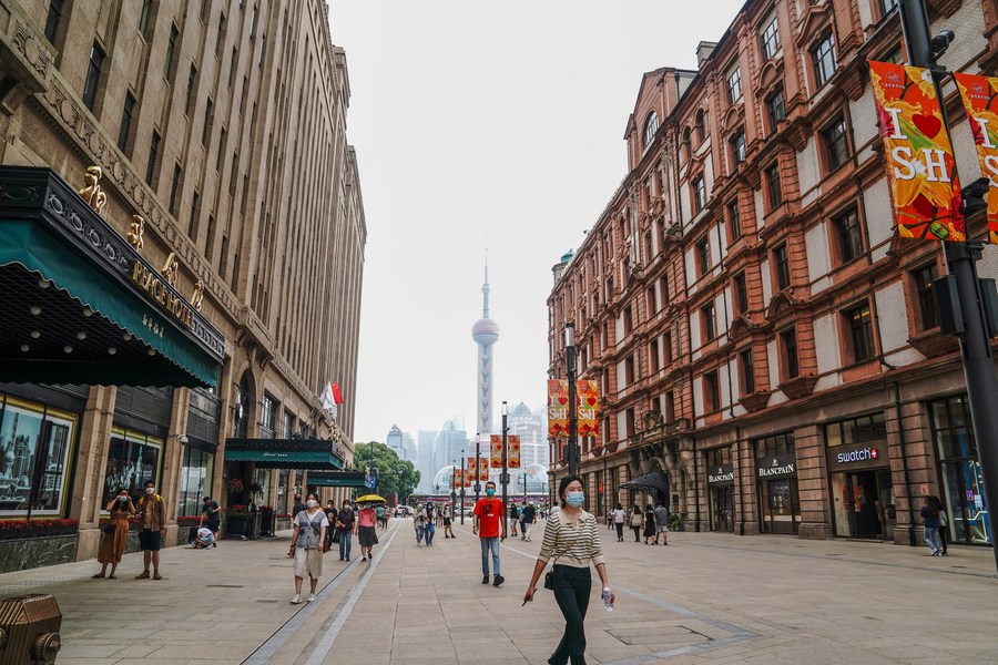 People walk on the Nanjing Road pedestrian street in east China's Shanghai, June 1, 2022. (Xinhua/Ding Ting)