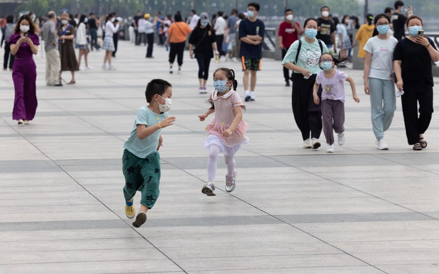 Children play at the Bund area in Shanghai, east China, June 1, 2022. (Xinhua/Jin Liwang)