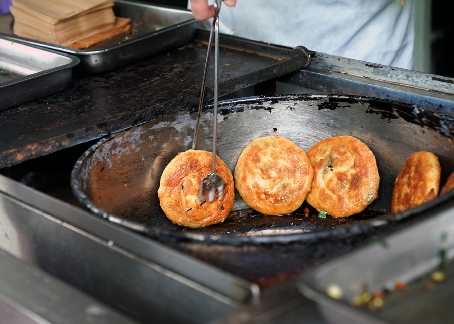 Photo shows the scallion pancakes at a breakfast restaurant in Minhang District of Shanghai, east China, June 1, 2022. (Xinhua/Liu Ying)