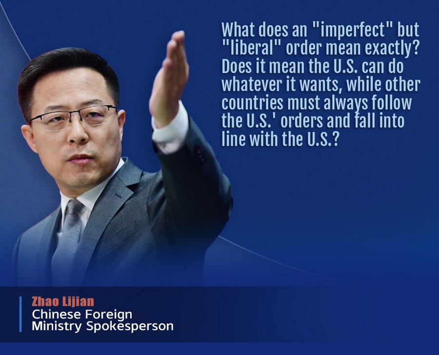 "Blinken claimed that they've sought to build an imperfect but liberal order. What does an 'imperfect' but 'liberal' order mean exactly? Does it mean the U.S. can do whatever it wants, while other countries must always follow its orders and fall into line with the U.S.?" Zhao said.