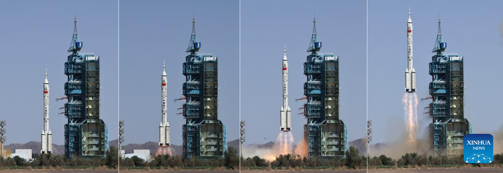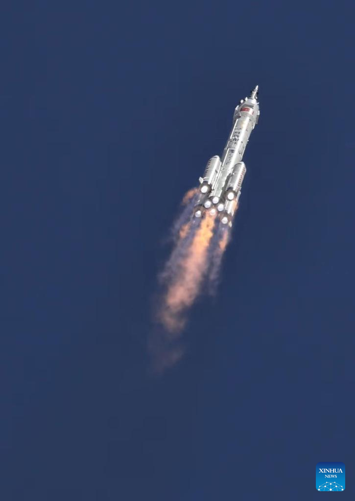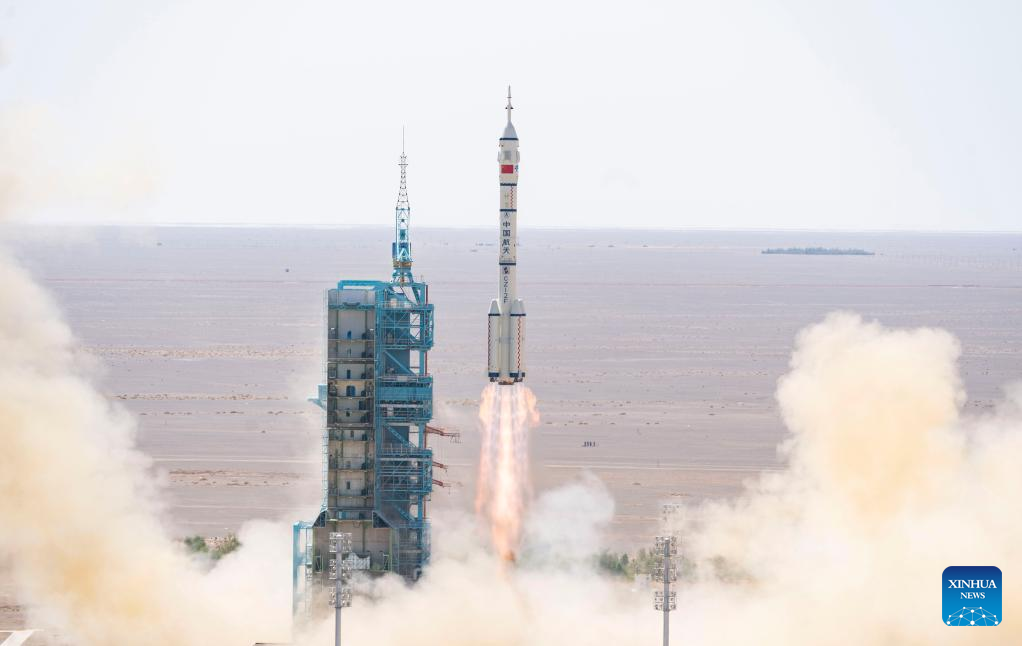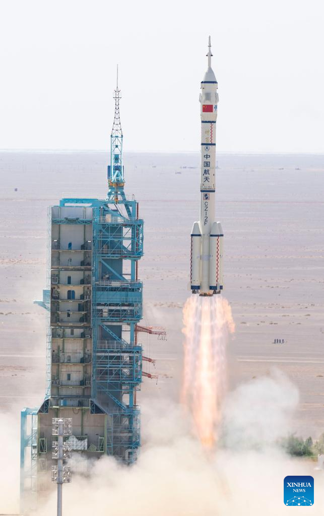 The crewed spaceship Shenzhou-14, atop a Long March-2F carrier rocket, is launched from the Jiuquan Satellite Launch Center in northwest China, June 5, 2022. (Xinhua/Li Gang)