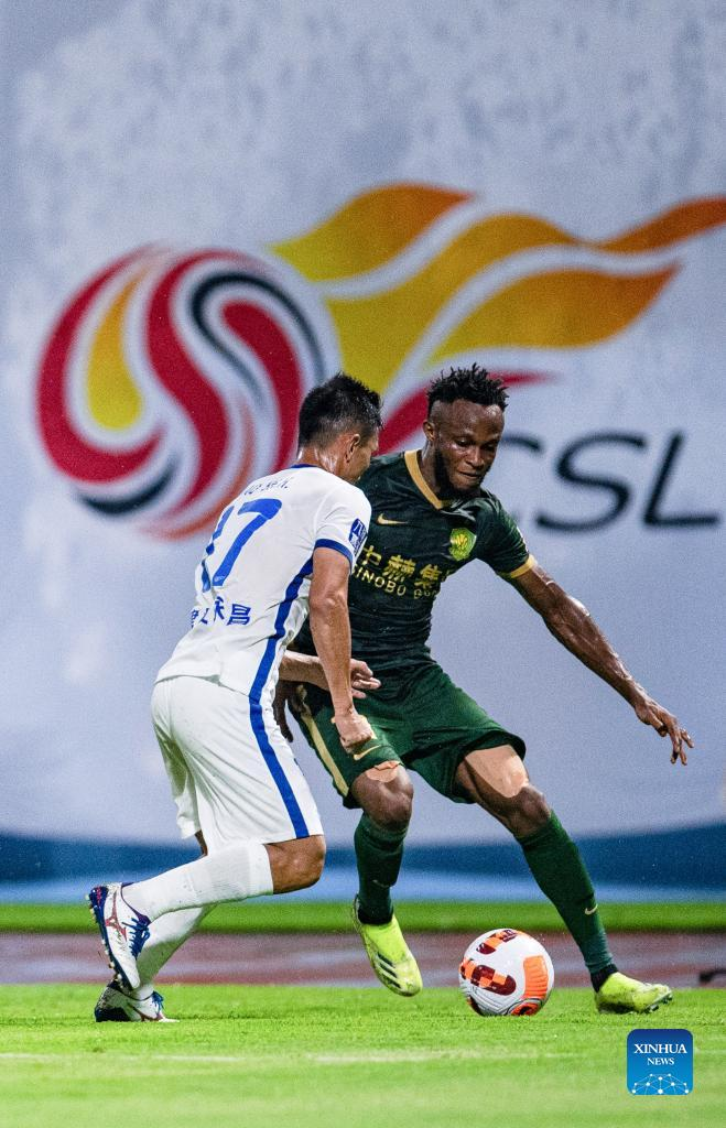 Samuel Adegbenro (R) of Beijing Guoan vies with Piao Shihao of Cangzhou Mighty Lions during a 2022 season Chinese Football Association Super League (CSL) match in Meizhou, south China's Guangdong Province, June 5, 2022. (Xinhua/Sun Fei)