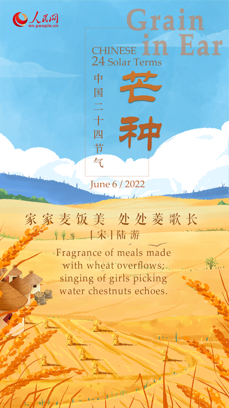 Grain in Ear is the ninth of the 24 solar terms and the third solar term of summer, indicating the beginning of midsummer. Grain in Ear, pronounced "Mang Zhong" in Chinese, literally means "awned wheat should be harvested quickly, awned rice can be planted". "Mang" is homophonic to the word "busy" in Chinese, indicating that all crops are "busy planting".