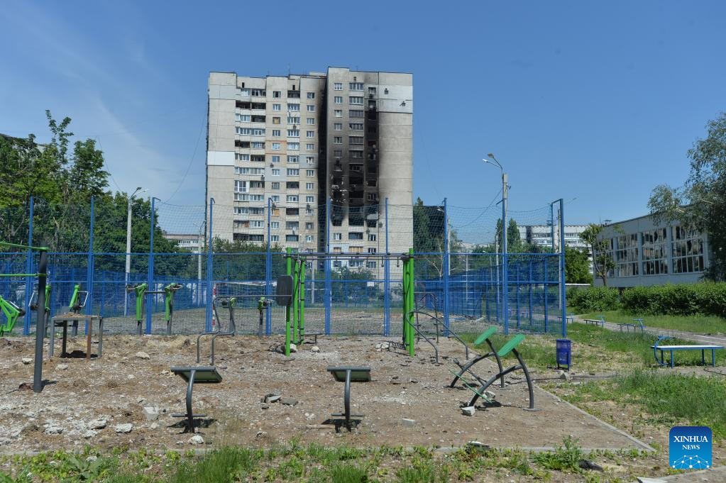 Photo taken on June 2, 2022 shows a damaged building in Kharkov, Ukraine. (Photo by Peter Druk/Xinhua)