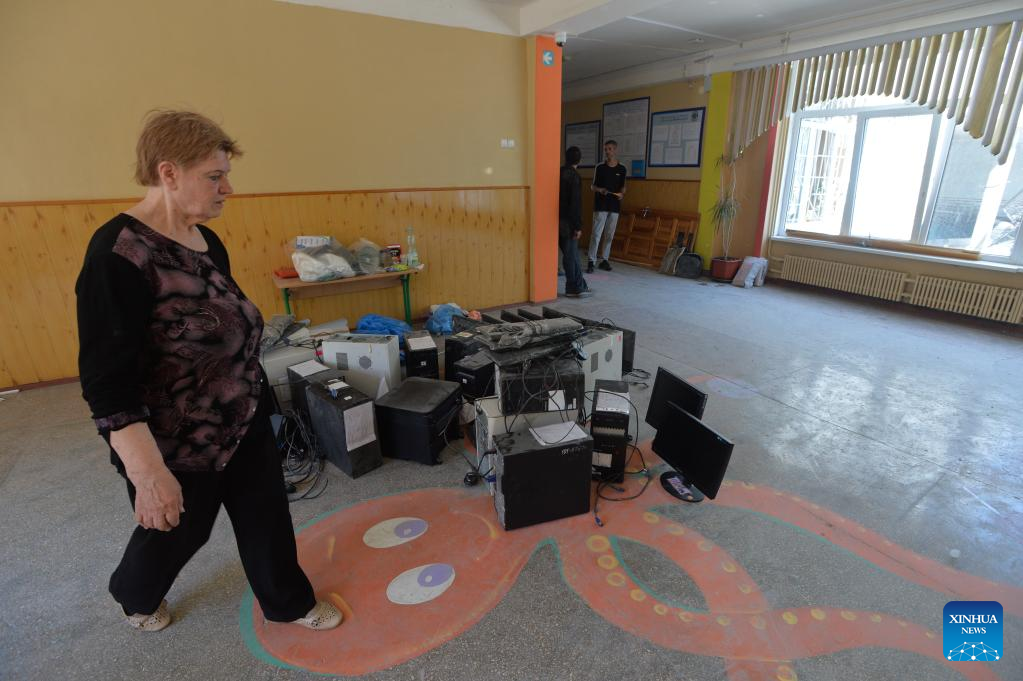 A middle school teacher collects computers and other equipment in Kharkov, Ukraine, June 2, 2022. (Photo by Peter Druk/Xinhua)