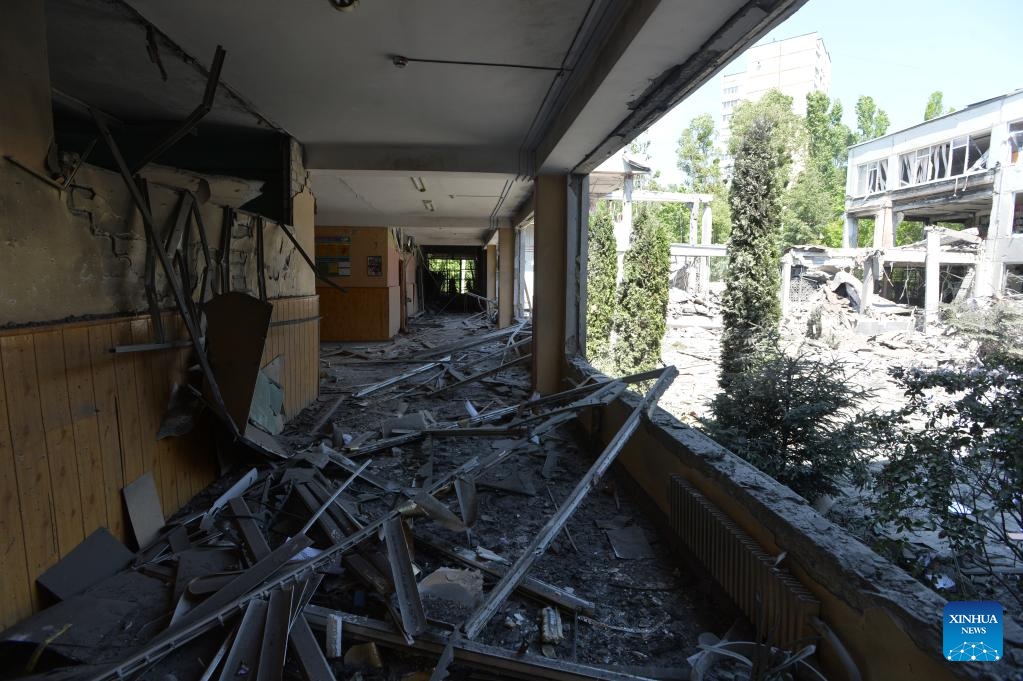 Photo taken on June 2, 2022 shows a damaged building at a middle school in Kharkov, Ukraine. (Photo by Peter Druk/Xinhua)
