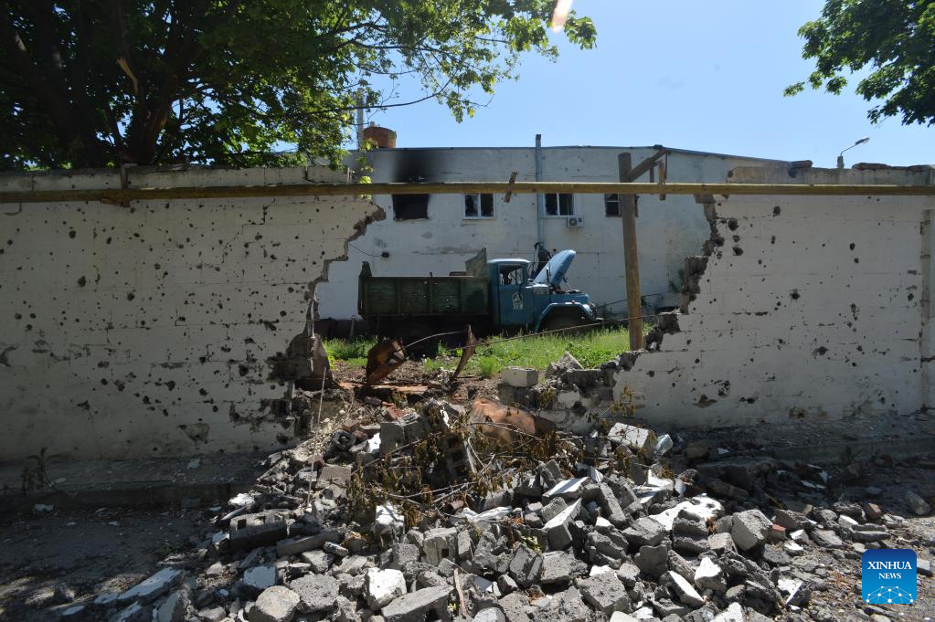 Photo taken on June 1, 2022 shows a damaged building in Kharkov, Ukraine. (Photo by Peter Druk/Xinhua)