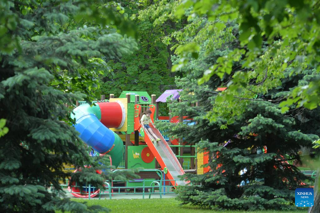 A kid plays on a slide in Kharkov, Ukraine, June 1, 2022. (Photo by Peter Druk/Xinhua)