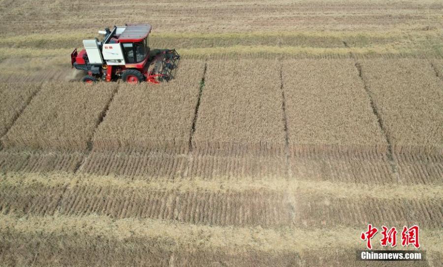 A harvester collects wheat in a wheat field in Beijie village, Xingtai, north China's Hebei Province, June 5, 2022. Farmers have started to harvest wheat in Hebei. (Photo: China News Service/Song Jie)