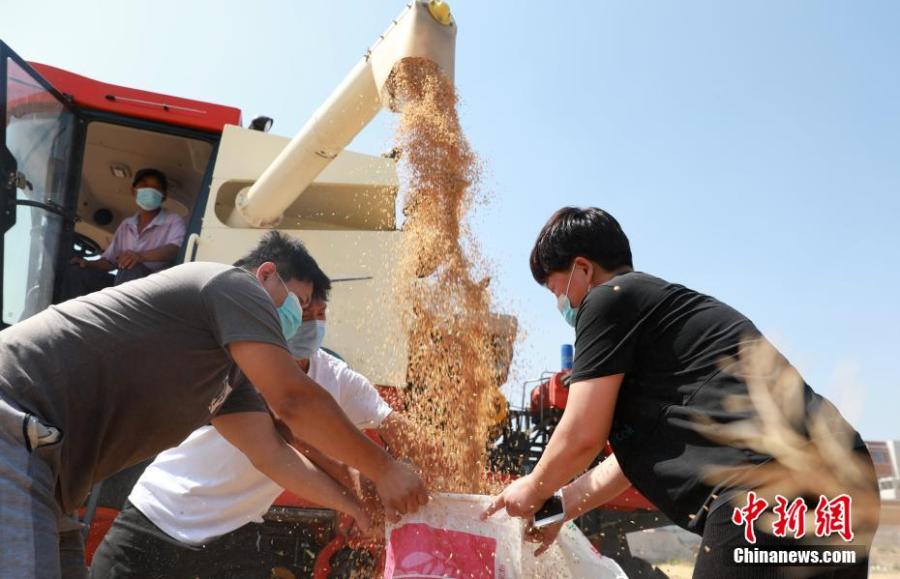 Farmers harvest wheat in a wheat field in Beijie village, Xinghai, north China's Hebei Province, June 5, 2022. (Photo: China News Service/Song Jie)