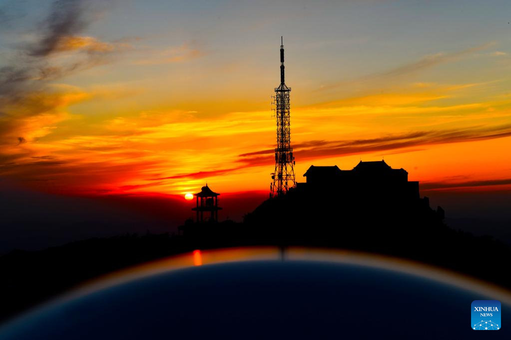 Photo taken on May 26, 2022 shows the sunset seen from Mount Taishan in east China's Shandong Province. (Xinhua/Guo Xulei)