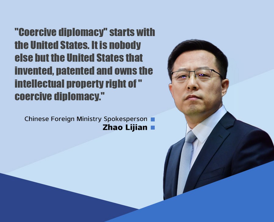 It is the United States that engages in "coercion diplomacy," Zhao said, adding that China has never resorted to any act of coercion and is firmly opposed to any other country doing so.