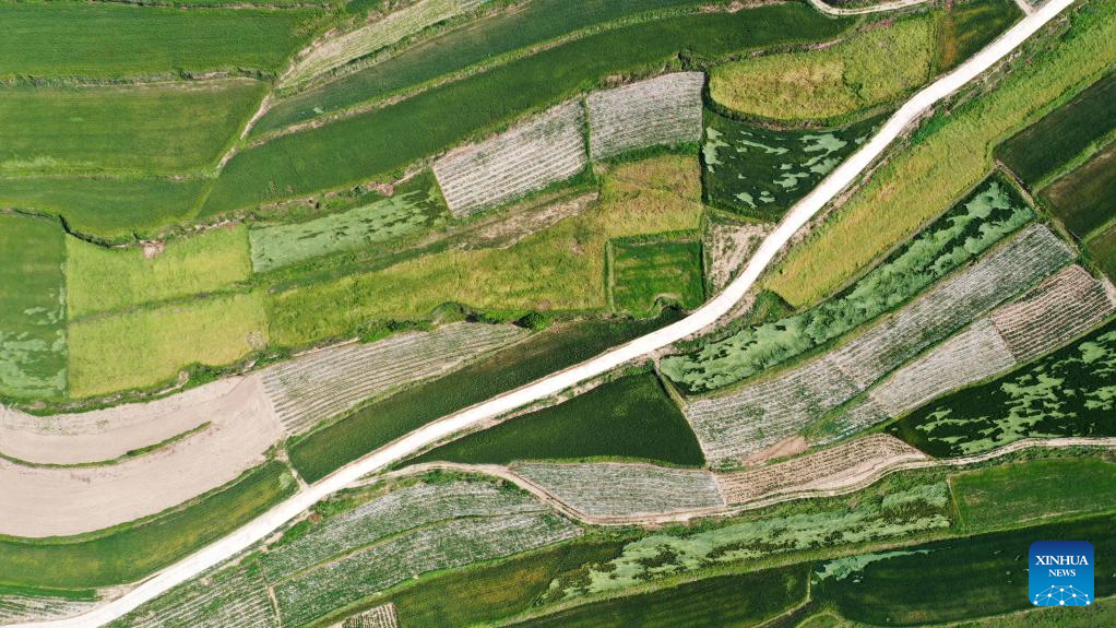 Aerial photo taken on June 6, 2022 shows Majiayuan terrace in Zhangjiachuan Hui Autonomous County in Tianshui, northwest China's Gansu Province. (Xinhua/Chen Bin)