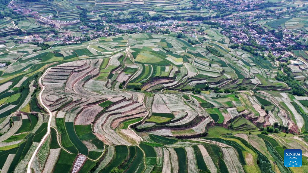 Aerial photo taken on June 6, 2022 shows Majiayuan terrace in Zhangjiachuan Hui Autonomous County in Tianshui, northwest China's Gansu Province. (Xinhua/Chen Bin)