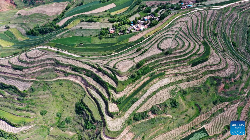 Aerial photo taken on June 6, 2022 shows Majiayuan terrace in Zhangjiachuan Hui Autonomous County in Tianshui, northwest China's Gansu Province. (Xinhua/Chen Bin)