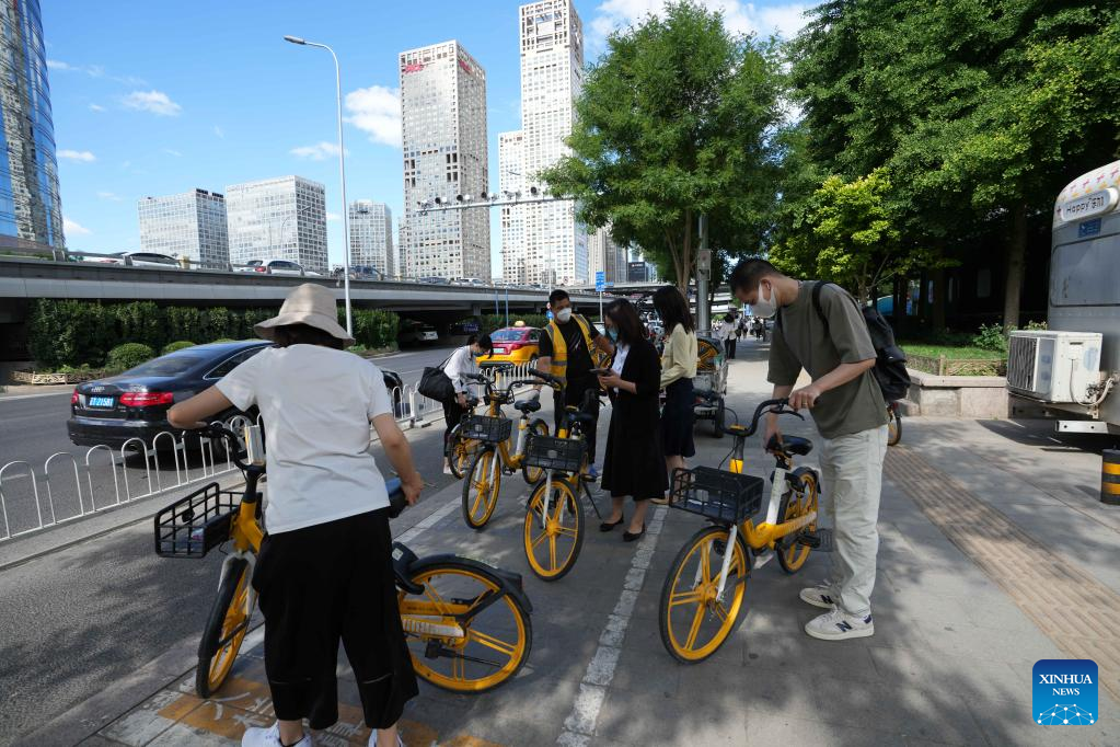 Passengers scan shared bikes outside a subway station in Beijing, capital of China, June 6, 2022.