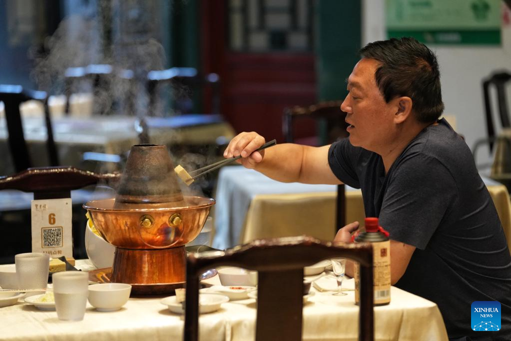 A man has lunch at a restaurant in Wangfujing of Beijing, capital of China, June 6, 2022. No new local COVID-19 infections were reported in Beijing in the 15 hours ending at 3 p.m. Monday, and no infections were registered at community level from Saturday to Monday afternoon, Pang Xinghuo, deputy head of the Beijing municipal disease prevention and control center, said at a press conference on Monday.