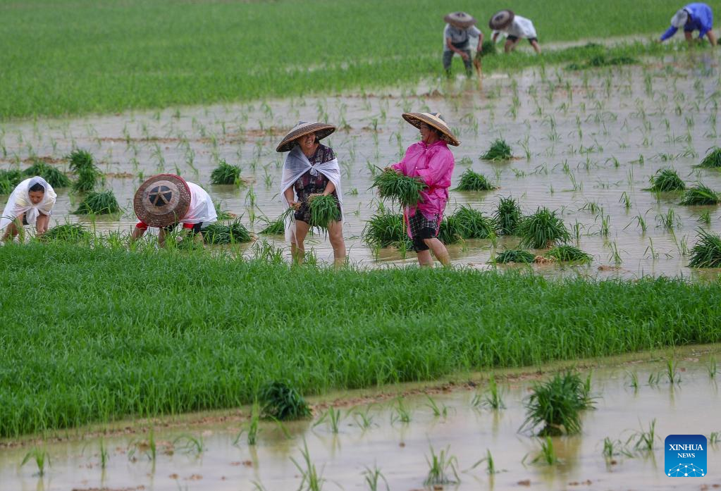Farmers are busy working in rice paddies ahead of the day of "Mangzhong", or "Grain in Ear", in Shashuiping Village, Xindian Township of Yuping Dong Autonomous County in Tongren City, southwest China's Guizhou Province, June 5, 2022.