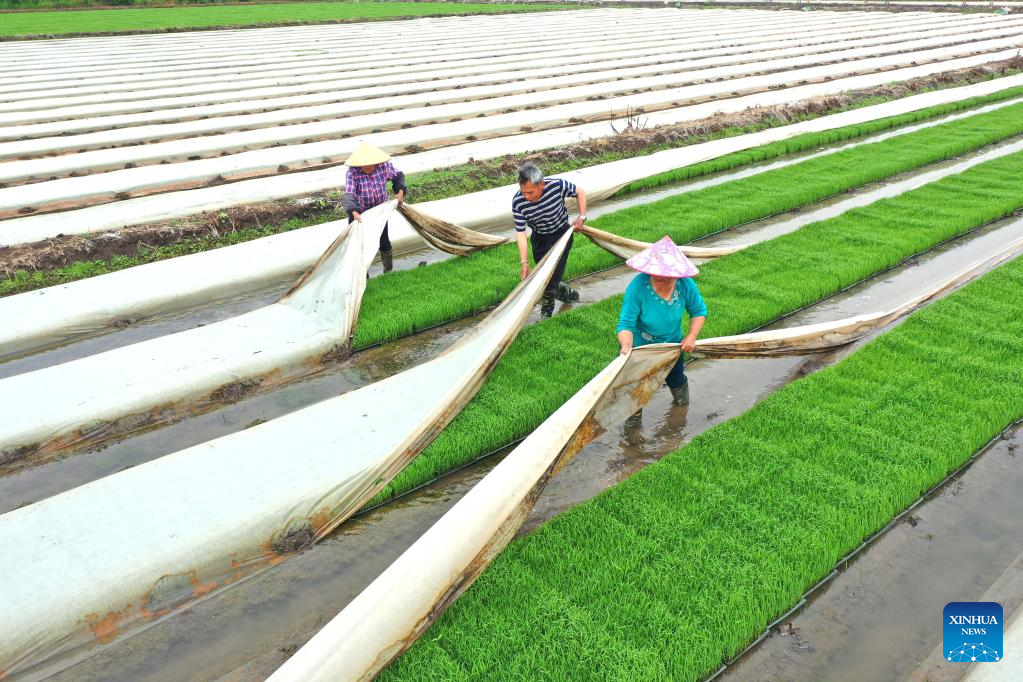 Aerial photo taken on June 5, 2022 shows farmers busy working in a rice paddy ahead of the day of "Mangzhong", or "Grain in Ear", in Shuangtang Village, Xiaji Township, Baoying County of Yangzhou, east China's Jiangsu Province.