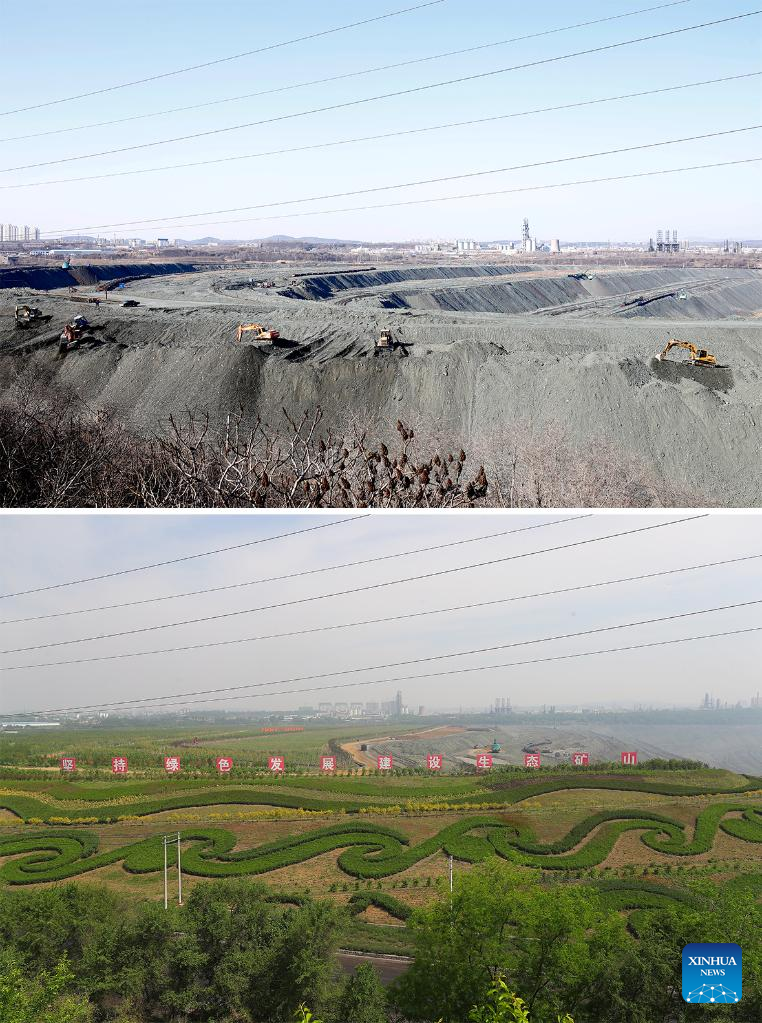 Bottom: The former west open-air mining pit after afforestation in Fushun City, northeast China's Liaoning Province, June 2, 2022 (Xinhua/Yang Qing).