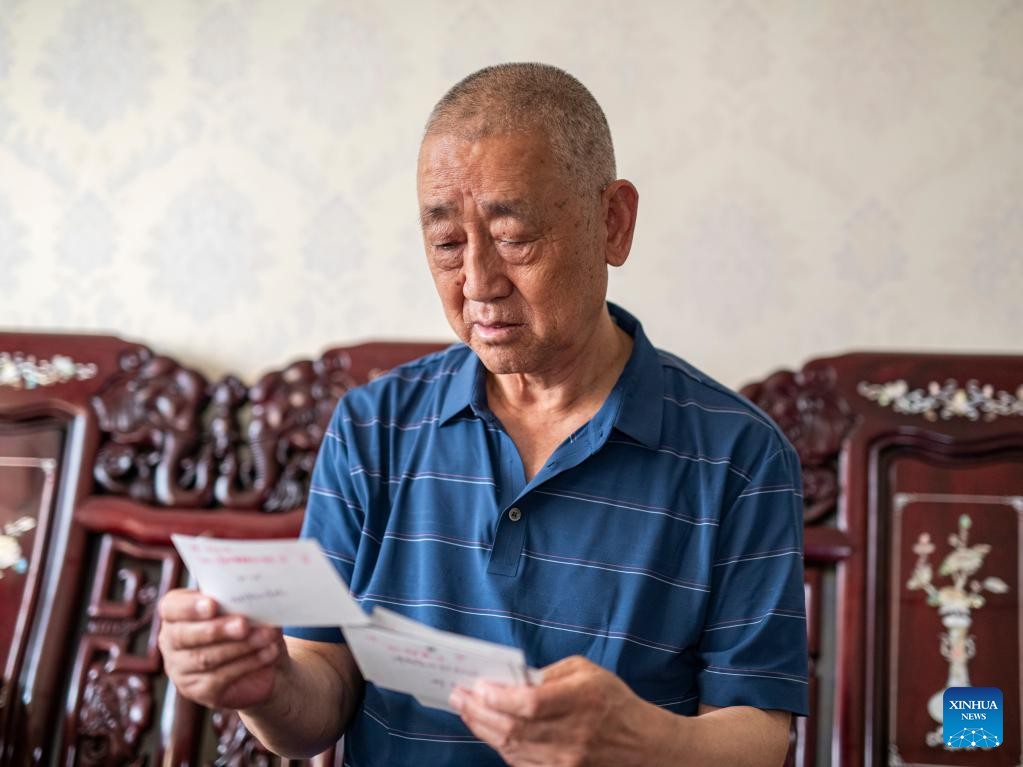 Retired Li Chunlu views old photos at home in Chengdu City, southwest China's Sichuan Province, June 3, 2022.