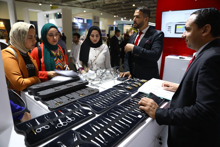 People visit medical tools at a booth during the Africa Health ExCon in Cairo, Egypt, on June 6, 2022. (Xinhua/Ahmed Gomaa)