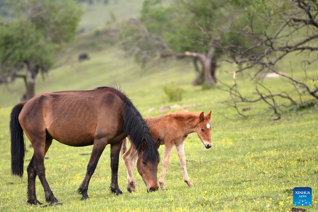 Horses graze on grassland at a forest farm of Guanshan Mountain in Zhangjiachuan Hui Autonomous County of Tianshui, northwest China's Gansu Province, June 7, 2022. (Xinhua/Chen Bin)