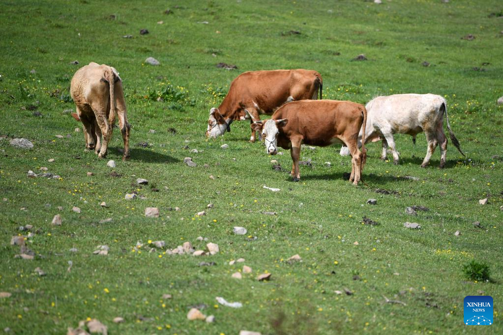 Cattles graze on grassland at a forest farm of Guanshan Mountain in Zhangjiachuan Hui Autonomous County of Tianshui, northwest China's Gansu Province, June 7, 2022. (Xinhua/Chen Bin)